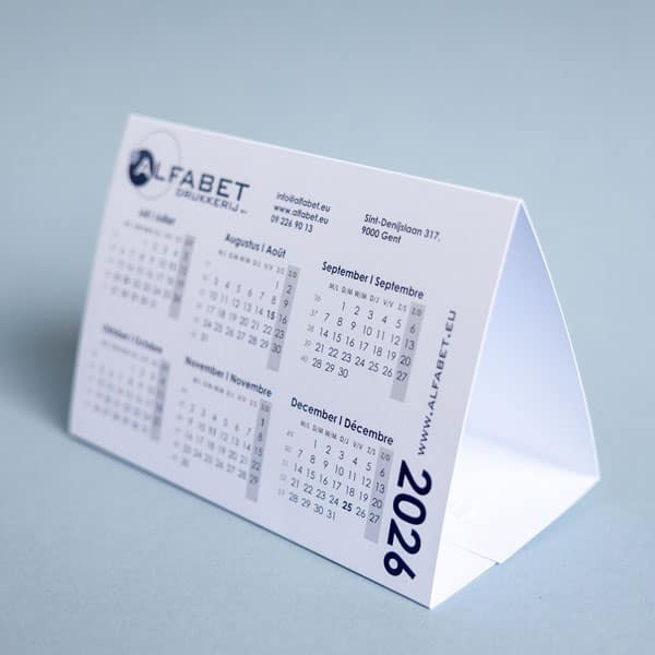 Van wandkalenders tot bureaukalenders: er zijn heel wat formaten en afwerkingen mogelijk. Gevouwen modellen, zoals een 4-luik wandkalender of een driehoekige bureaukalender, passen netjes in een envelop en zijn eenvoudig te versturen via de post.